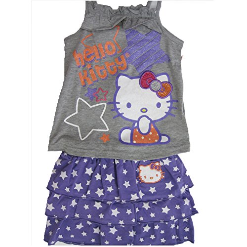 Simply adorable, great summery outfit for your little girl from Hello Kitty! Cozy soft 2 piece set includes a gray tank top with ruffle neckline and print that matches perfectly with the tiered star patterned purple skirt. Nice casual outfit especially for a Kitty fan.Feature