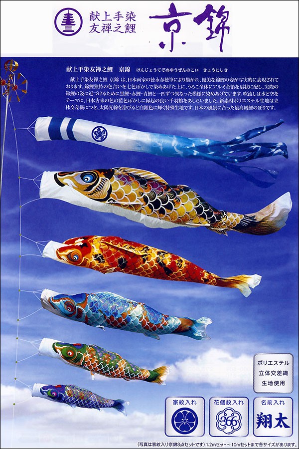 | 京錦 鯉 庭園用大型鯉のぼり 杭打込式ポール付セット | 1.5m鯉3匹 | 2m鯉3匹 | 3m鯉3匹 3m鯉4匹 3m鯉5匹 | 4m鯉3匹 4m鯉4匹 4m鯉5匹 |