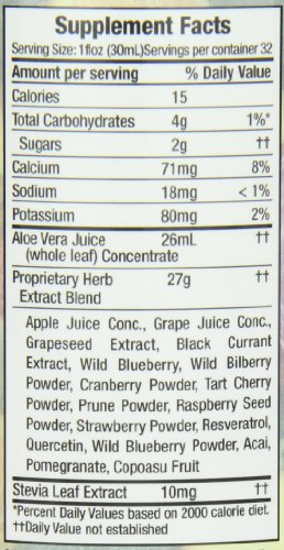 ReleaseDate : 2013-04-09 Studio : Aloe Life Publisher : Aloe Life Binding : Health and Beauty Product Description Antioxidants from super fruit including grapes, berries and other exotic fruit bring high orac value of 2400 in every serving to support body wellness and reach everyday health goals for the entire family. contains 82% aloe vera leaf concentrate. Support body wellness. 0