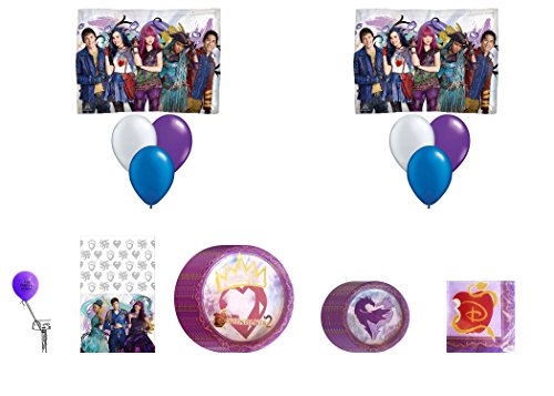 -. Feature : Disney descendants 2 birthday party supplies bundle kit including plates, napkins - 16 guests. / 8 ct descendants lunch plates, 16 ct descendants lunch napkins, 16 ct dessert plates. / Balloon bouquet 2 mylar descendants double sided, 2 silver latex balloon, 2 purple latex balloon, 2 blue latex balloon. / 1 disney descendants 2 table cover 54 in x 96 in. / 1 bonus the party is here latex balloon (colors vary) no helium included.