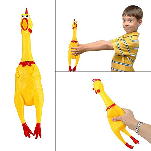 -. Feature : 1 piece Squeeze Fun Squawking Chicken. / Made from durable rubber, can withstand countless of fun squeezing. / Rubber chicken measures 17 inches long. / Perfect for kids, adults and also a perfect chew toys for your dog. / Easy to play just squeeze and let it squawk.