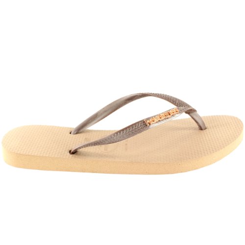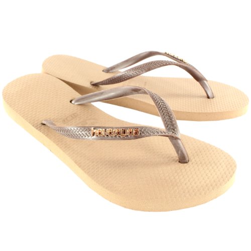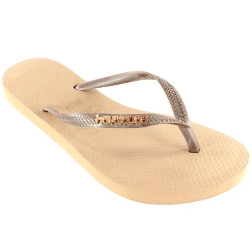 Binding : Apparel Product Description Havaianas have designed a Slim Metallic flip flop named Slim Logo. The flip flop features a secret Brazilian rubber formula, Havaianas branding embossed on the foot bed, and the flip flop is finished off with a flexible and durable sole and the Havaianas branding on the metallic straps. 0