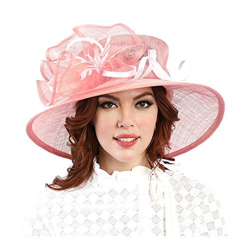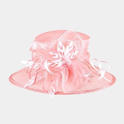 Binding : Apparel Product Description Kentucky Derby Church Wedding Pink Dressy Organza Ribbon Hat 264348 USA SELLER Soft romantic beauty for that special spring/summer event, including the Kentucky Derby! Details ? Color : Peach ? Theme : Bow, Feather ? Crown Circumference : 23" ? Crown Height : 4" ? Brim Width : 5" ? 100% SINAMAY ? Feather Satin Bow Accented Sinamay Hat 0