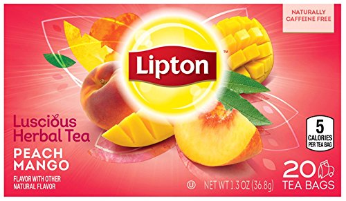-. Binding : Grocery -. Brand : Lipton -. Feature : Uplifting when enjoyed hot or refreshing when enjoyed as an iced tea. / Conveniently packaged in 20 individually wrapped tea bags, Lipton Peach Mango Herbal Tea delivers the sweet and juicy taste of Peach and Mango that is naturally caffeine free. / Cup of Hot Tea: Pour boiling water over a tea bag and brew 2 to 3 minutes. Stir in milk if desired and sweeten to taste. -. Label : Unilever -. Manufacturer : Unilever -. NumberOfItems : 6 -. PackageQuantity : 6 -. ProductGroup : Grocery -. ProductTypeName : GROCERY -. PublicationDate : 2015-11-10 -. Publisher : Unilever -. ReleaseDate : 2015-11-10 -. Studio : Unilever -. Title : Lipton Herbal Tea, Peach Mango, 20 Count (Pack of 6)