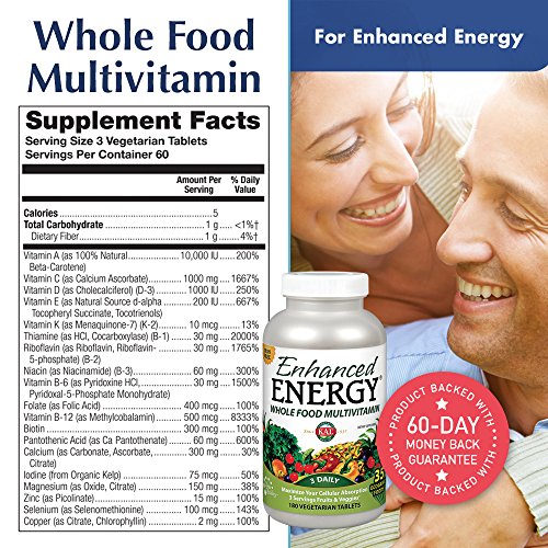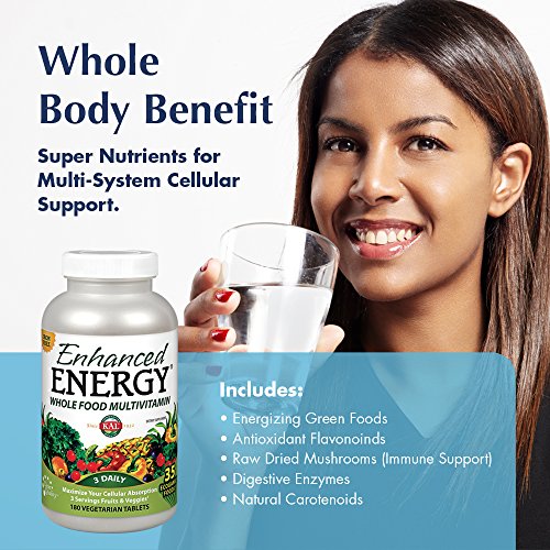 KAL Enhanced Energy provides a balanced whole body approach to daily nutrition with its synergistic blend of Vitamins, Minerals and Real Food co-factors. This amazing, iron free Whole Food Multi contains the nutrient equivalent of three servings of Organic Fruits & Vegetables, plus Energizing Green Foods, Antioxidant Flavonoids, Raw Dried Mushrooms for immune support, Digestive Enzymes, and Natural Carotenoids for multi-system cellular support.