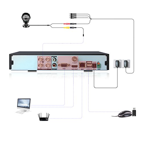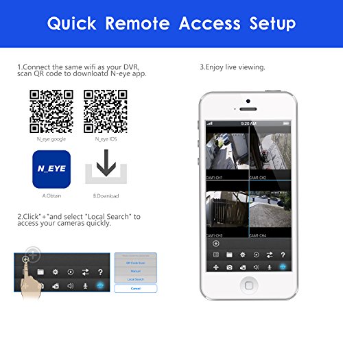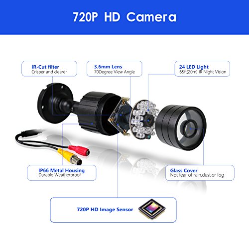 -. Feature : HD Video Quality: AHD security cameras deliver 720P HD 1200 TVL video and up to 80 feet (20m) IR night vision / Easy Remote Access: Set up remote access via free app in minutes; Remote viewing on your windows PC and mobile devices anywhere. / Motion Detection Recording: this recording mode allows you save more capacity hard drive. Live view and playback on your Smartphone. / 1080N DVR w/ HDMI Port Output: HDMI port for High Resolution Viewing via HD TV or PC monitor; VGA port output are optional. / Purchase Guarantee: 1-year warranty, 30-day return, lifetime tech support
