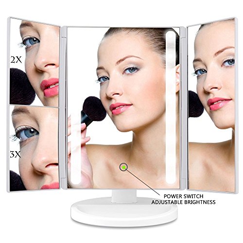 Vanity Mirror Make Up Tri-Fold with 24Pcs Lights 180 Degree Free Rotation Adjustable Stand for Countertop Cosmetic Makeup (White)