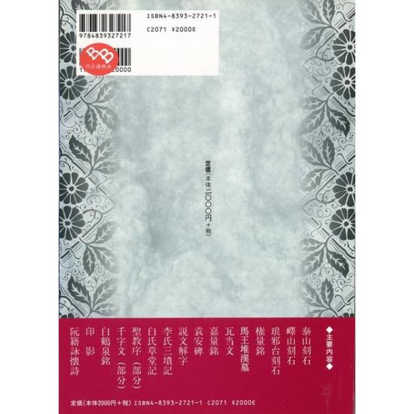 【商品説明】 定価(税込み):2,160円 値引き:10% OFF 代表的な古典名跡から、条幅作品に適し、その名跡の特徴が顕著に現れている部分を厳選し収録した、篆書古典の臨書・作品手本。 バーゲンブック 新品 特価 格安 諸芸 書道 書画 書道具 書集 |