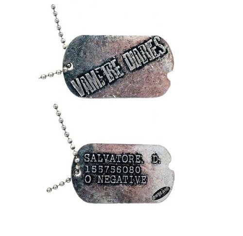 -. Binding : Toy -. Brand : Vampire Diaries -. EAN : 0609456845359 -. Model : Slavatore, D. Dog Tag -. MPN : 63447 -. PackageQuantity : 1 -. PartNumber : 63447 -. ProductGroup : Toy -. ProductTypeName : TOYS_AND_GAMES -. Title : Vampire Diaries Salvatore D. Dog Tag Necklace TV Show -. UPC : 609456845359