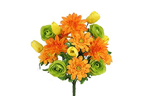 - 18 stems artificial tulip, Dahlia and Ranunculus greenery mixed bush size: 20"H x 12"W x 9"D.