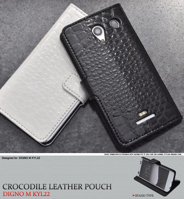 クロコダイルレザーデザインのDIGNO M KYL22用スタンドケースポーチ。