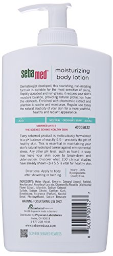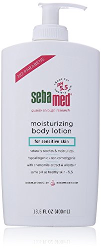 Sebamed moisturizing body lotion for sensitive skin 13.5 oz. Dermatologist developed, this nourishing, non-irritating formula is suitable for the most sensitive of skins. Rapidly absorbed and non-greasy, it restores your skin's moisture balance, providing natural protection from the elements. Enriched with chamomile extract and allantois to soothe and moisture. Regular use tones the natural elasticity of your skin for a more youthful, healthy and radiant appearance.Feature