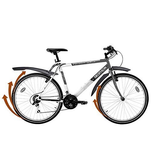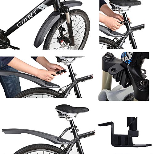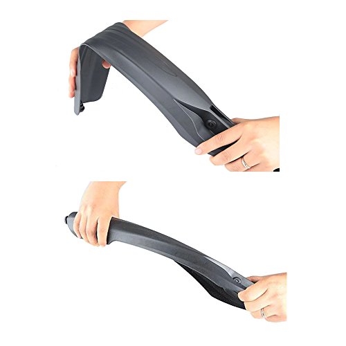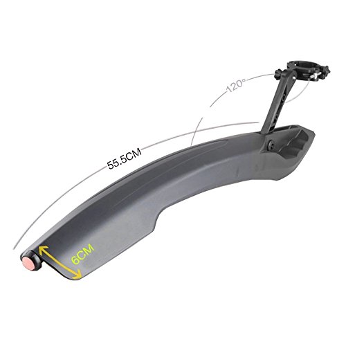 -. Feature : Broader fenders and taillight makes riding in rainy day and night much safer. / Made of high elasticity material, can be twisted freely, not easily broken, quite strong and extremely durable / This fender set is compatible with mountain bikes with standard front forks including reverse opening designs. Quick and easy installation (the rear fender angle is adjustable). / The front fender with 4 sizes expandable nuts, fits the front fork reserve opening diameter of 0.87" to 1.08"; The rear fender with quick release mounting design, fits the seat tube diameter from 0.8" to 1.1" / The front fender length * width: 21.8" * 4.8"; the rear fender length * width = 21.9" * 4.9"