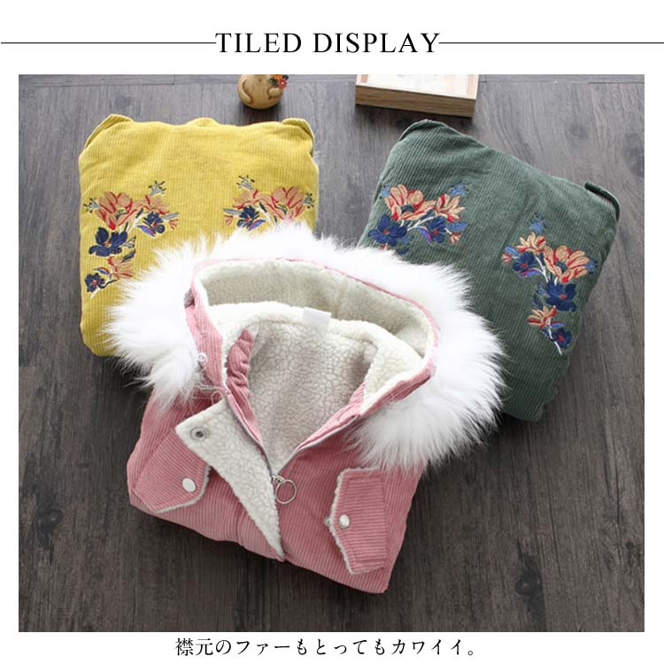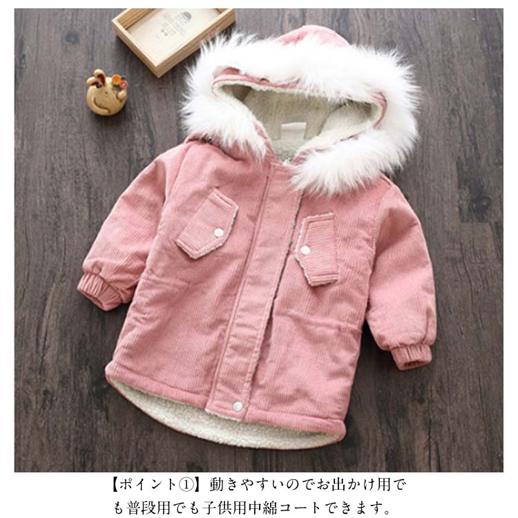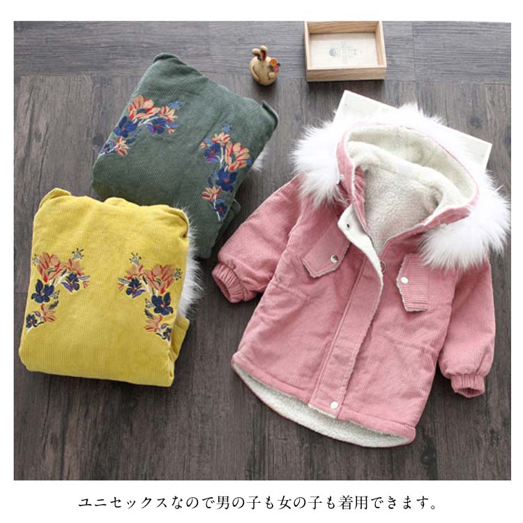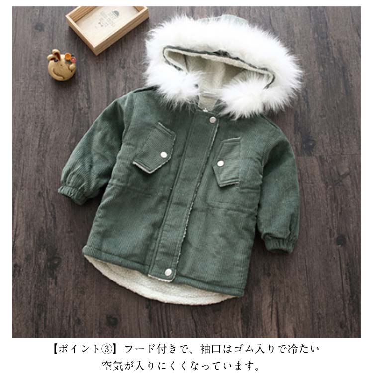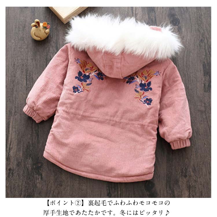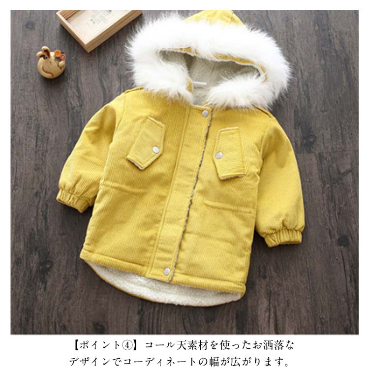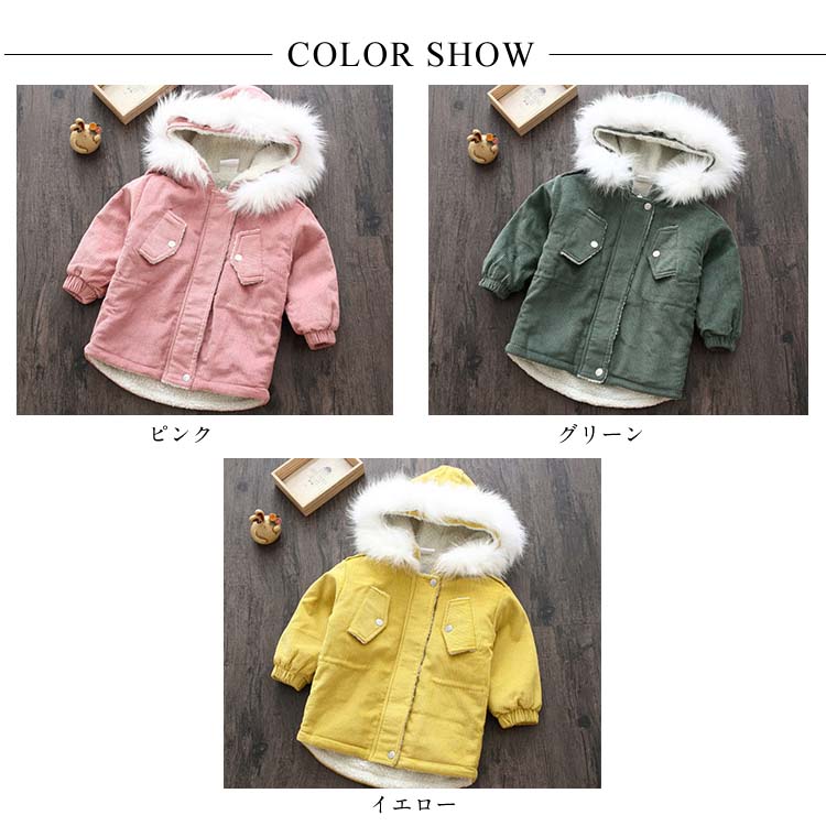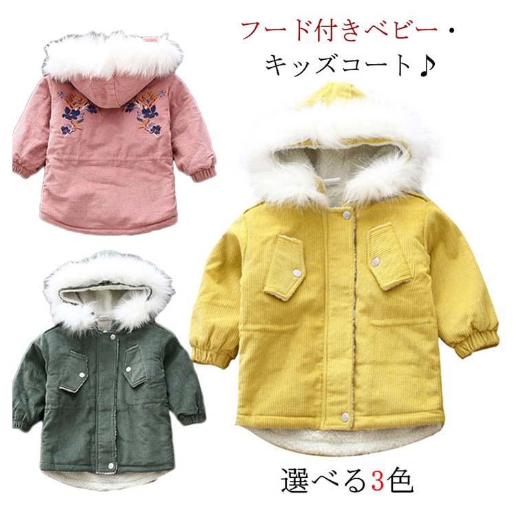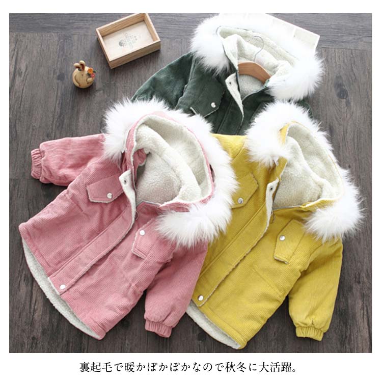 | フード付きベビー・キッズコート♪襟元のファーもとってもカワイイ。裏起毛で暖かぽかぽかなので秋冬に大活躍。ユニセックスなので男の子も女の子も着用できます。 | |