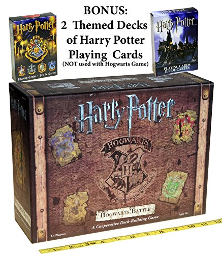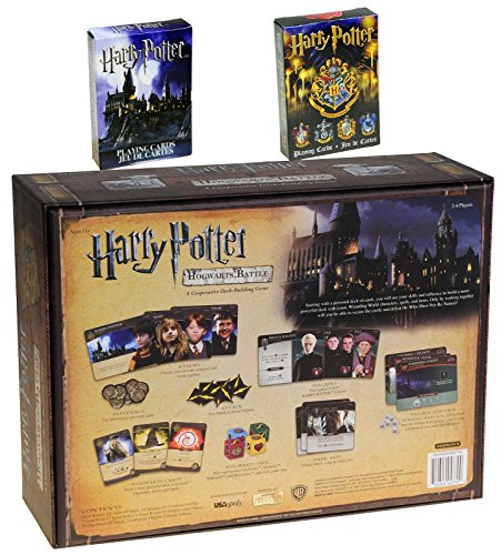 -. Binding : Toy -. Brand : Deluxe Games and Puzzles -. EAN : 0703546238561 -. Feature : Harry Potter Themed Cooperative Game for 2 to 4 players. Recommended for ages 11 to 105 years. / All players cooperatively act as Heros against the Game (Villains) from controlling all the locations. / Bonus two decks of uniquely-themed, full-color Harry Potter Playing Cards. Bundled Items. Not USED in Hogwarts Game. / Designed to be played over a series of seven increasingly difficult adventures. / Players take on the role of Harry Potter, Ron Weasley, Hermione Granger or Neville Longbottom. -. IsAdultProduct : 0 -. Label : Deluxe Games and Puzzles -. Manufacturer : Deluxe Games and Puzzles -. MPN : USA047700_BUN -. PartNumber : USA047700_BUN -. ProductGroup : Toy -. ProductTypeName : TOYS_AND_GAMES -. Publisher : Deluxe Games and Puzzles -. Studio : Deluxe Games and Puzzles -. Title : Harry Potter Hogwarts Battle _ A Cooperative Deck Building Game _ Bonus 2 Unique Decks of Harry Potter Themed Playing Cards _ Bundled Items -. UPC : 703546238561
