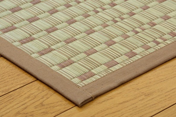 掛川織は九州筑後地方の伝統的な織り方です。大きな目と小さな目に交互に織り込んだ美しく洗練されたモダンなデザインが人気です。また、厳選された良質の太く長いイ草を高密度に織り込んでいますので丈夫で耐久性があり、しかも素足に心地よいクッション性とボリューム感があります。国産(九州産)のい草を使用しています。一本一本が太く、表皮が厚く繊維がキメ細かいので弾力性があり、耐久性に優れています。い草には空気の自然浄化作用、湿度の調節作用などがあります。また汚れにくく、使用するうちに黄金色に変化し味が出ます。い草に青森ヒバ加工を施しています。(抗菌、防臭効果)