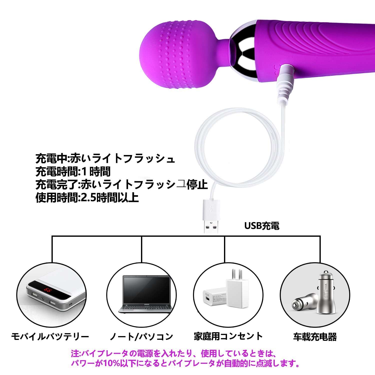 ♥【USB充電式】このマッサージ器を内蔵の高品質リチウム電池は、一度満充電で最大2.5時間連続使用できます。頻繁に電池交換は不要、経済型の電マ。 電動マッサージ器小型で軽量、持ち運びも便利です。旅行や出張といったお出かけのお供にもピッタリ!いつ、どこでもお手軽にマッサージできます。充電中は使用できません!