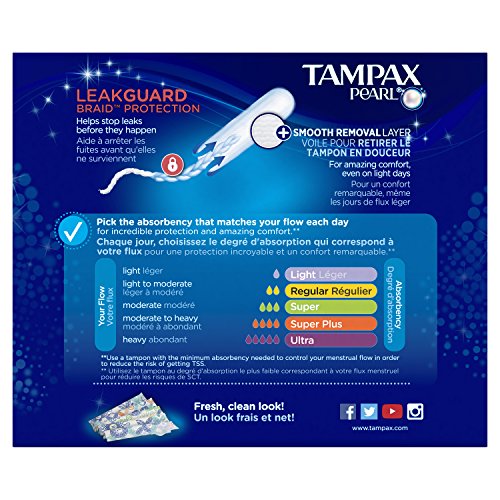Get protection and comfort every time! Only Tampax has a unique Leak Guard Braid that helps stop leaks by channeling them back into the core, giving you ultimate protection even on your heaviest days. The Smooth Removal Layer gives you amazing comfort, even on your lightest days. Insertion of the tampon is always easy and comfortable with the smooth Pearl applicator. Form Fit protection helps close the gaps that can cause leaks, giving you up to 8 hours of protection. Tampax Pearl tampons come in a variety of absorbencies so you're protected from your light days to your heavy days. Feel confident with Tampax Pearl, knowing that you get protection and comfort all day.Feature