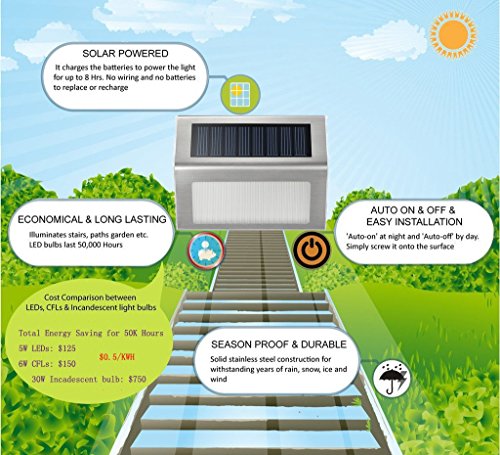 【Dusk to Dawn Solar Deck Lights】Auto on at night/off by day, each light features 3 led ultra bright chips, last 30000 Hours, make steps safer to walk on at night