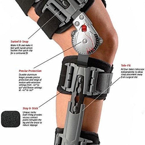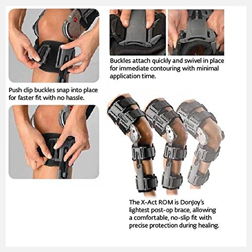 -. Binding : Health and Beauty -. Brand : DonJoy -. Color : Black/Gray -. EAN : 6520475191514 -. Feature : Swivel & Snap - Make it fit and make it fast with swivel action buckles that quick-clip for a contoured fit. / Precise Protection - Durable aluminum hinges provide precise protection and range of motion with extension settings from -10° to 90° and flexion settings at -10° to 120°. / Stay & Stick - Unique, tacky foam lining provides viscous contact points between the leg and the brace to reduce slippage. / Tele-Fit - All four sliders telescope independently to allow strap placement away from surgical site. / Universally sized, fit most Adults. -. Label : Donjoy -. Manufacturer : Donjoy -. MPN : 11-2151-9 -. PackageQuantity : 1 -. PartNumber : 11-2151-9 -. ProductGroup : Health and Beauty -. ProductTypeName : HEALTH_PERSONAL_CARE -. Publisher : Donjoy -. Size : universal adult -. Studio : Donjoy -. Title : DonJoy X-Act ROM Post-Op Knee Brace