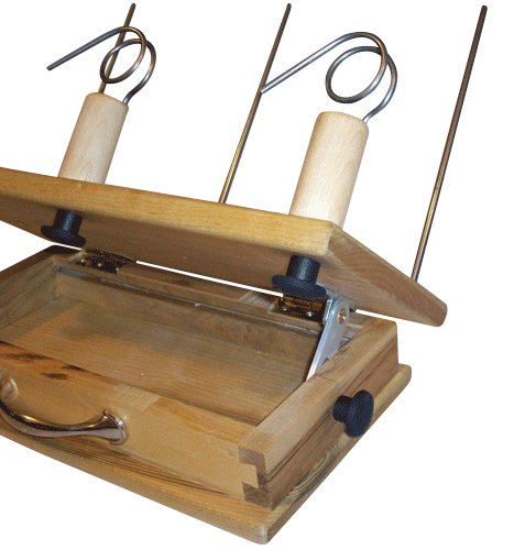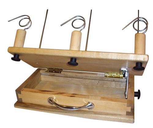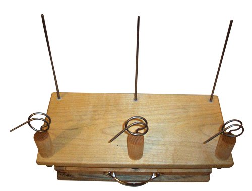 Dovetailed hardwood box even stores all of the guides, rods, peg, and knobs inside