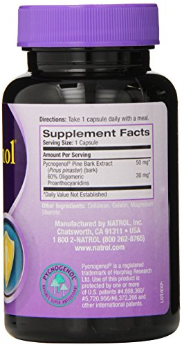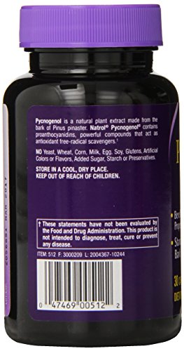 Studio : Natrol Publisher : Natrol Binding : Health and Beauty Product Description Natrol Pycnogenol (?pic-noj-en-all?) is a potent antioxidant and a natural compound which is extracted from the bark of the European maritime pine tree (Pinus pinaster) by a patented process. Natrol Pycnogenol utilizes a patented process that is lab tested and uses clinically tested ingredients to bring you the highest quality of active ingredients. Pycnogenol contains proanthocyanidins -- powerful compounds that act as free radical scavengers. As one of the most powerful natural antioxidants, Pycnogenol acts to protect and repair cells from damage caused by reactive oxygen species such as free radicals. Free radicals not only directly cause cell injury but can also interfere with your immune system to cause the acceleration of the aging process. Fighting off damage with antioxidants helps keep your immune system strong and healthy. Antioxidants may also improve the health of skin and reduce wrinkles. Natrol Pycnogenol boosts the immune system, promotes a healthy cardiovascular system, and supports circulatory health, and skin health. Natrol makes this product in the U.S.A.! 0