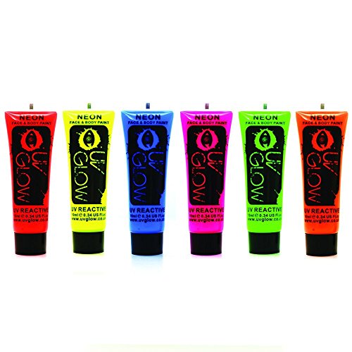 UV Glow 6 x 10ml UV-Bodypaint Korpermalfarben Schwarzlicht fluoreszierende Schminke Bodypainting Neon Farben Leuchtfarben