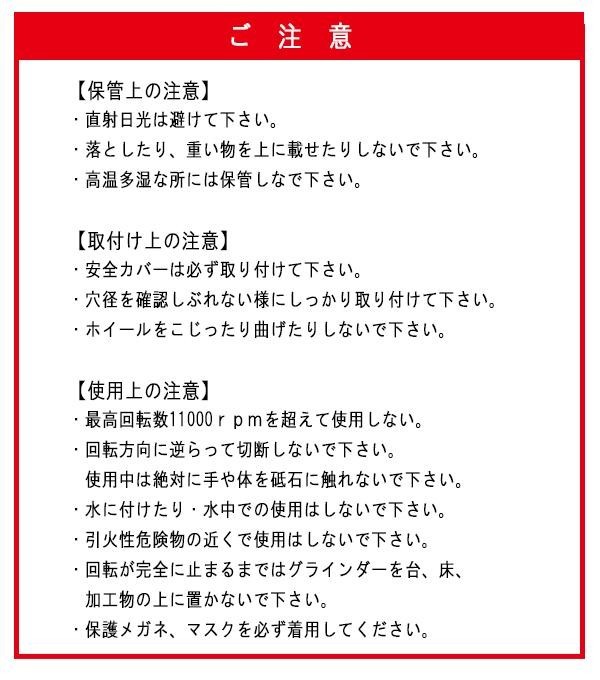 | 仕様 | 金属切断用(用途:丸棒・アングル・鋼材等) 長寿命薄型 両面補強 最高回転数:11000min-1(rpm)※72m/s 適応機種:外径125(22穴)電気グラインダー |