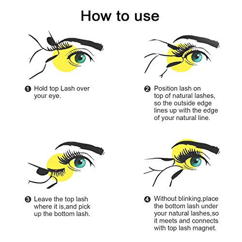 HOW TO USE: For a better result, curl your natural eyelashes before first use, and apply some mascara to hold the curl so it will be easier to wear. ( Note: Do not apply mascara directly to the magnetic eyelashes ) 1.Carefully bend the magnetic lashes to follow your eyes curve, then trim off it to fit your eyes length or your preferred length. 2.Position one piece lash on top of your natural lashes, adjust the outer edge to in line with the edge of your natural lash line. 3.Without blinking, place the bottom lash under your natural lashes, ensure the bottom magnets connect with the top lash magnets. If you want to look more natural, you can make up some eye shadow or eyeliner.