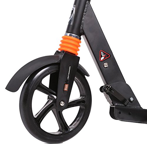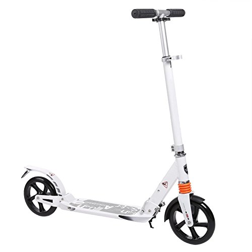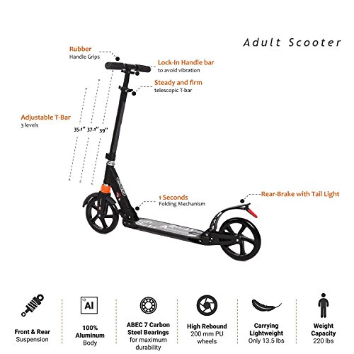 -. Feature : High density durable aluminum alloy frame, precision technology of rear brake / suspension with good stable and security. An incredibly smooth glide, perfect for city/urban/suburban pavements / Adjustable T-bar?Adjustable handlebar with soft rubber comfortable hand grips and 3 level height adjustable, range 32.3-41.7 inch, Suit for adult, teens and kids age 8 up, Support weight 220lbs / Suspension System and an easy to access Anti-Rust Paint Foot Rear Brakes with which when pressed brings the scooter to a speedy secure stop.Scooter will not rust because of the aluminum alloy / No assembly request, easy to fold and carry,3-seconds easy-folding system, suit for city urban scooter's quick storage and transportation / Upgraded proccess and quality, Shipping from US (US Stock),100% refund without any hesitation if our product couldn't meet your request