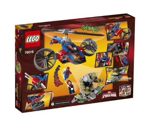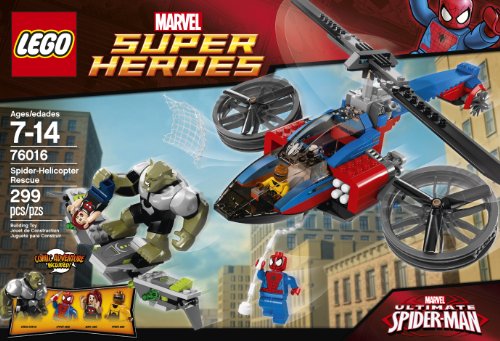 -. Binding : Toy -. Brand : -. Color : red -. EAN : 0673419212274 -. Feature : Includes 3 minifigures: Spider-Man, Power Man and Mary Jane and a Green Goblin figure / Features Spider-Helicopter and Green Goblin glider; Glider features 2 deadly flick missiles; Also includes Spider-Man's spider web / Spider-Helicopter features spinning rotors, opening cockpits, web net shooter, missile cannon and 4 flick missiles / Shoot the net and put the Green Goblin in a tangle! Activate the cockpit release and send Spider-Man swinging to the rescue! Dodge the flick missiles! / Spider-Helicopter measures over 4" high, 11" long and 10" wide; Green Goblin glider measures over 1" high, 2" long and 6 " wide -. Genre : strategy -. IsAdultProduct : 0 -. ItemPartNumber : LG-870 -. Label : -. Manufacturer : -. Model : 6062393 -. MPN : LG-870 -. NumberOfItems : 1 -. PackageQuantity : 1 -. PartNumber : LG-870 -. ProductGroup : Toy -. ProductTypeName : TOYS_AND_GAMES -. Publisher : -. ReleaseDate : 2014-03-01 -. Studio : -. Title : Superheroes 76016 Spider-Helicopter Rescue -. UPC : 885211954553 -. Warranty : No Warranty