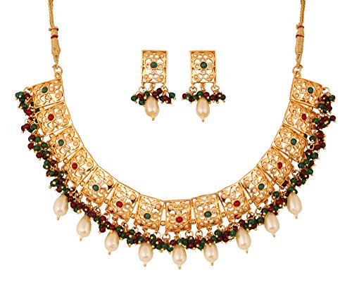 Alloy metal, gold tone, a gracious Inspiration of Mughal era style chic patti necklace set, decorated with faux pearls, ruby and rhinestones. For Perfect Matching, search for TOUCHSTONE BANGLES.