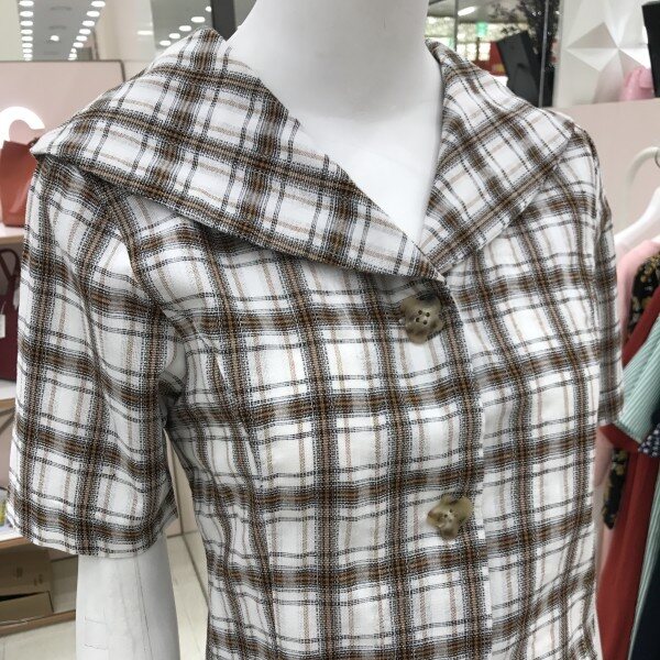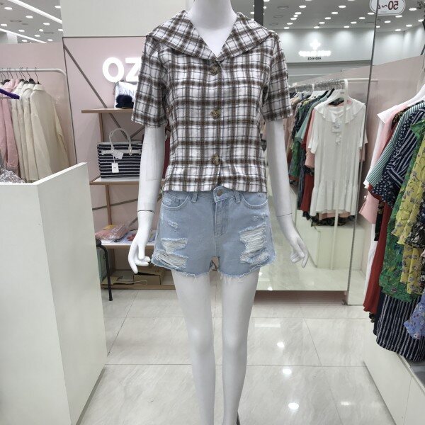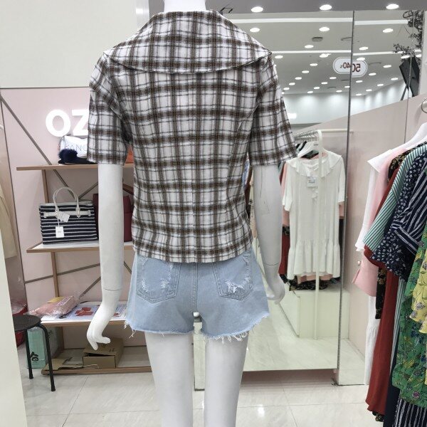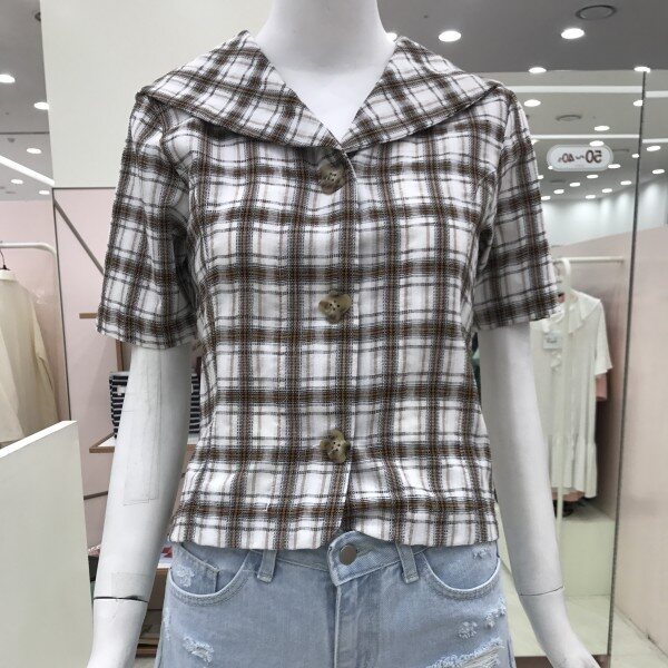 체크 무늬의 깔끔한 디자인의 블라우스입니다.셔츠형의 디자인과 단정하면서도 넥라인의 카라와 플라워 모양의 단추로 소녀스럽고 사랑스러움을 더했습니다.가볍과 시원한 소재로 비침이 없어 부담없이 입기 좋으며 청바지나 치마 모두 다 잘 어울립니다.