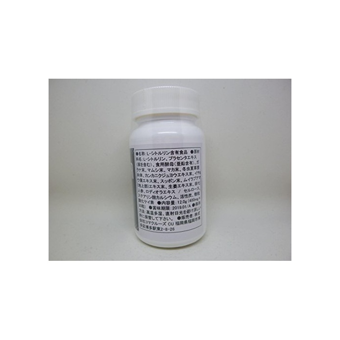 원재료:L-《시토루린》,프라센타(태반) 엑기스(돼지를 포함한다)고, 식용 효모(아연 함유)고, 갈 라《나》말,살무사말,《마카》말,동충하초균사체,캔 게 제비《요우에키스》말,은행나무잎 엑기스말,자라말,《무이라푸아마》(지상부)엑기스말,생강 엑기스말,전7(당근)인삼,로디 오라 엑기스/셀룰로오스,스테아린산 칼슘,활성탄,미립 산화 규소