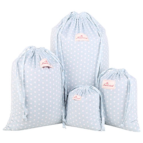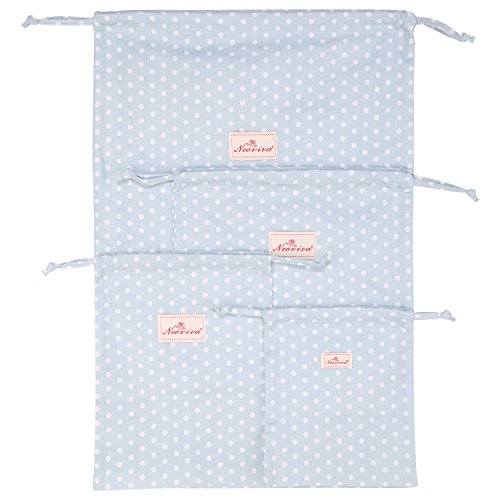 Neoviva Floral Fabric Drawstring Storage Bag for Laundry, Set of 4 in Different Sizes, Polka Dots Ballad Blue