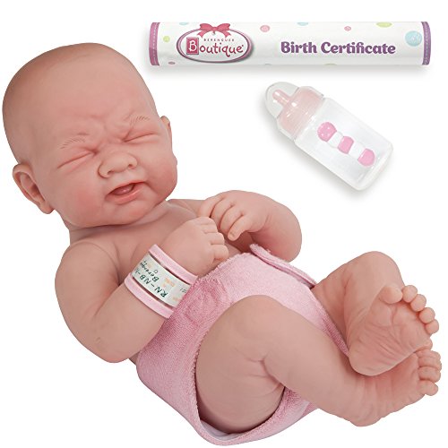 If you’re looking for an anatomically correct, full-vinyl baby doll baby doll that captures the once-in-a-lifetime experience of bringing home a new baby, then this La Newborn is the perfect doll for you! Made in Spain for children ages 2 or older, this La Newborn doll comes with several pretend accessories - a reusable cloth diaper, realistic hospital ID bracelet, hospital belly button gauze, and birth certificate. Every feature of the La Newborn was hand-designed in Spain by Designed by Berenguer, an award-winning team of doll specialists. The result of their expert work is a doll with finely-detailed features, like cute and crinkly toes, life-like eyes, and realistic expressions that encourage nurturing. The doll is 14" long and weighs 1lb. 8 ounces. No shortcuts were made in the making of this doll. You can keep it good as new for several years or more because of its durable and easily washable vinyl body. To make the doll brand new again, all it takes is a simple spot wash with warm water and mild soap. The body is unscented and the only moving parts are the jointed shoulders, hips, and neck. These rotating body parts allow you to easily add and remove the doll’s clothing for cleaning and dress-up fun. The La Newborn is manufactured directly by our company, JC Toys, a world leader in doll manufacturing. JC Toys is a family run and operated business with origins dating back to 1982 in south-east Spain - one of the top major toy-making and design centers in the world. Today, you can find 100s dolls, playtime accessories, and more by JC Toys on www.amazon.com/jctoys Add smiles to a young child’s face today by adding this La Newborn to your cart now, so it can be ready for checkout and shipment ASAP - thank you!Feature