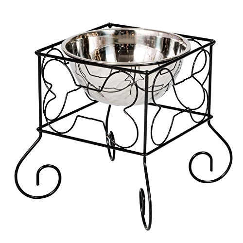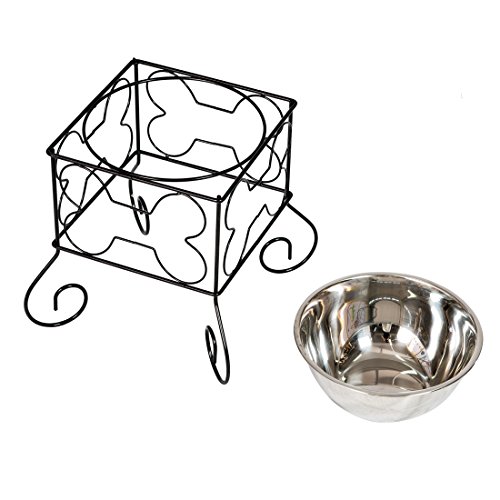 Product Description 10" wrought iron stand with single stainless steel feeder bowl in Black stand with bone design. Capacity of the bowl is 2.5L. Material: Iron Stand Stainless Steel Bowl Color: Black 0