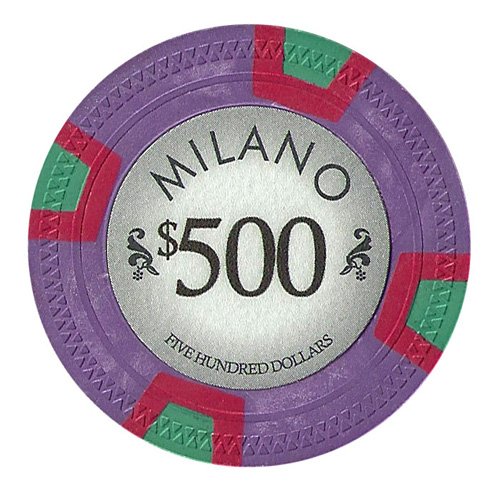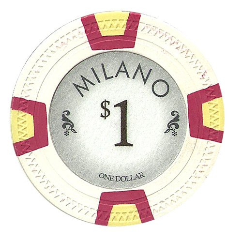 The Milano inlay uses a very clean and regal design that prominently features the denomination in the center of the poker chip. The fictitious casino destination "Milano" is written along the top of the inlay. The denomination is spelled out at the bottom of the poker chip. The layout of this inlay poker chip is similar to the very popular Bellagio poker room casino chip.