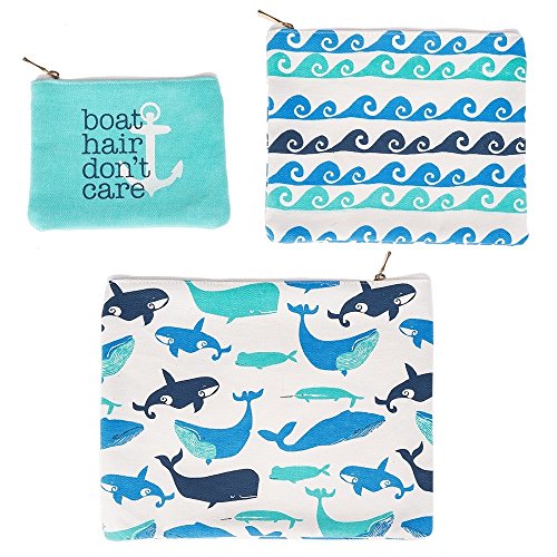 Boat Hair Don't Care Whale Waves Blue Canvas Zippered Storage Pouches Set of 3