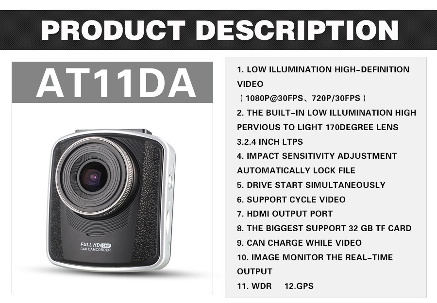 - Function: Full HD 1080P 2.4 inch HDMI output G-sensor 170 degree wide angle lens car camcorder