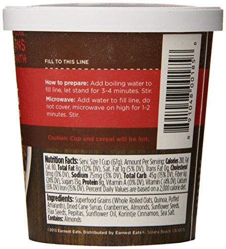 - Feature : INSTANT BREAKFAST: Our Hot & Fit Cereal Cups are great for on-the-go use and already sweetened for you to enjoy. All you need to do is add hot water to start your day with a delicious breakfast to feed your taste buds, body and spirit. / DELICIOUS HOT CEREAL: Our Hot and Fit cereal has super food grains plus fruits, nuts, and seeds for a powerhouse of nutrition, energy and flavor to power your day. / ALL NATURAL SUPERFOOD: Earnest Eats is about believing in nutrition density vs. calorie density. Our hot cereal is high in fiber with superfoods: Quinoa, Oats and Amaranth. Our non-GMO verified breakfast is packed with 8g of protein & 7g of fiber. / THE EARNEST EATS DIFFERENCE: A portion of our sales is donated to the mission of the International Rescue Committee to lead refugees from harm to home. / AMERICAN BLEND: Our American Blend Hot Cereal combines our unique Superfood grain blend of Oats, Quinoa, and Amaranth and Pepitas (pumpkin seeds) with Sunflower Seeds, Cranberries, Almonds and Flax Seeds.