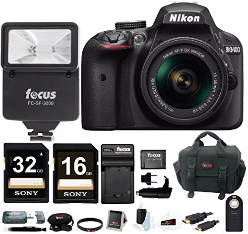 Nikon D3400 DSLR Camera with AF-P DX 18-55mm Lens (Black), + Flash + SLR Photo Bag + Batteries and Charger + Remote + 48GB Card Bundle
