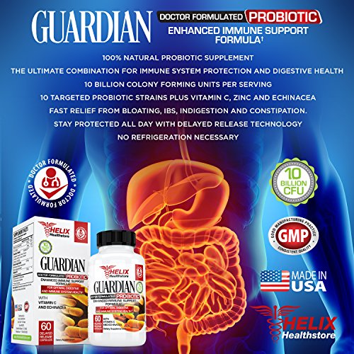 THE ONLY PROBIOTIC YOU NEED FOR COMPLETE IMMUNE SUPPORT AND OPTIMAL DIGESTIVE HEALTHHelix Healthstore offers you the most effective Immune Support Probiotic available on Amazon today! We only use the highest quality ingredients to give you the maximum protection. Guardian time release Probiotic & immune system booster is designed to be stomach acid resistant and restore the beneficial flora in your gastrointestinal tract. The ultimate multiple strain Probiotic Complex which contains only the finest ingredients in easy to swallow vegetarian vegan pills . Non GMO & gluten free with zero artificial ingredients. Our Probiotic Supplement is formulated by doctors and is safe, pure and potent.