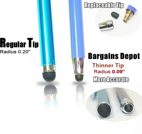 - Title : Bargains Depot® [0.18-inch Rubber Tip Series] 2Packs Stylus (Blue & Black) --- (length: 5.5", tips: 0.18"Diameter) SILM / ACCURATE / THINNER TIP Capacitive Stylus/styli Universal Touch Screen Pen for all touch screen Tablets & Cell Phones with 6 Extra Replaceable Soft Rubber Tips - 2PCS in one Package
