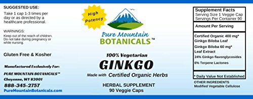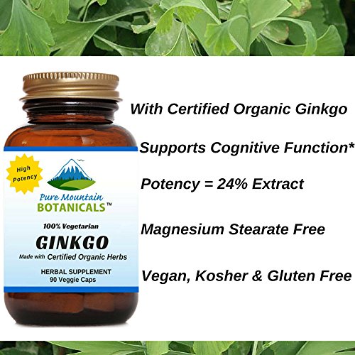 - Feature : Contains Certified Organic Ginkgo Biloba Powder and Potent Extract to help You feel the best with support for brain and mental function.* / Our Ginkgo Biloba Supplement is standardized to contain 24% Ginkgo Flavonglycosides & 6% Terpene Lactones / Our Ginko Biloba is VEGETARIAN, KOSHER and GLUTEN FREE. Feel Secure Knowing You're Only Putting the Absolute Best Product in Your Body, Made with NO Harsh Preservatives, Fillers or Flowing Agents - NO Sodium Benzoate, NO Magnesium Stearate, NO GMOs / 460 mg per vegetarian capsule / 90 capsules per bottle / 100% MANUFACTURE'S MONEY BACK GUARANTEE - Try the Best - Risk Free! These Organic Ginkgo Biloba capsules and ALL Products from Pure Mountain Botanicals™ are covered by a no-questions asked money back guarantee.