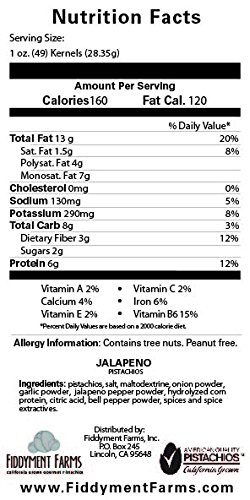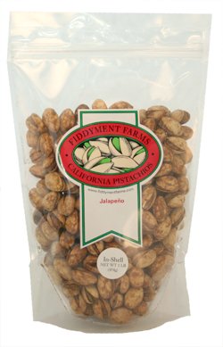 -. Feature : 1 pound of our gourmet Jalapeno flavored in-shell pistachios in a convenient, resealable bag. / A delicious and healthy snack, naturally Gluten Free and Non-GMO. / Pistachios processed in small batches to ensure freshness and top quality. / Naturally opened California grown jumbo sized pistachios. / The premier gourmet pistachio company since 1968.