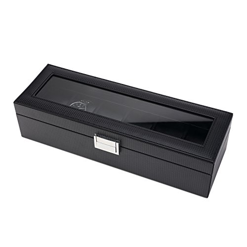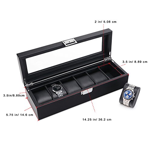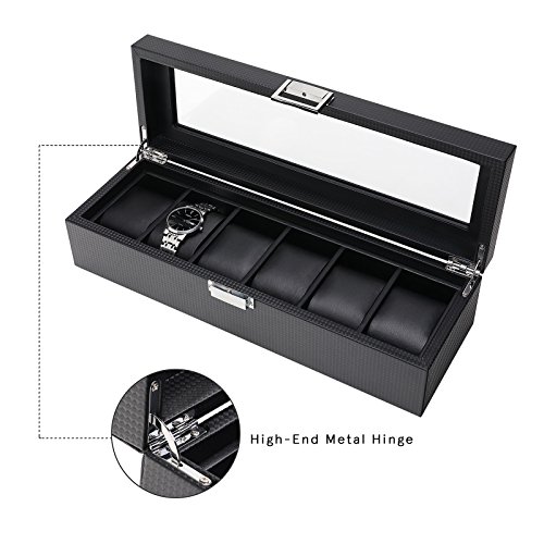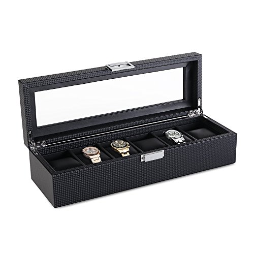 SWEETV 6 Slot Watch Box for Men - Carbon Fiber Watch Display Storage Case Organizer with Glass Top, Black