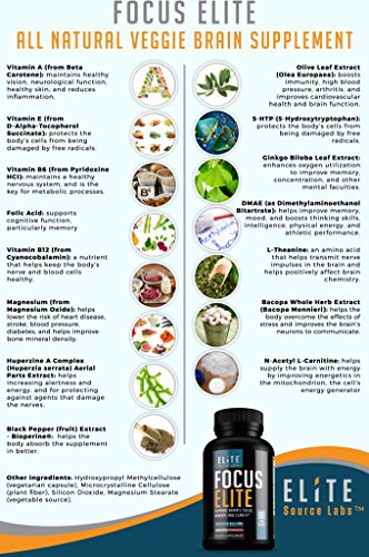 -. Feature : BRAIN SUPPORT MULTIVITAMINS and HERBALS: our natural nootropics focus supplement has all the important ingredients to support your brain health. Only Focus Elite product sold by our AdeptTrends is our original. / EXTRA STRENGTH BRAIN BOOST FORMULA: packed with vitamins: A, E, B6, B12, DMAE, Magnesium, Folic Acid, herbs: Ginkgo Biloba, Bacopa Monnieri Whole Herb Extract, Aerial Plant Extract, and more. / KEEP YOUR CLARITY and ENERGY UP so you can stay focused throughout the day and get your work done. Get your supper brain back with 2 Focus Elite brain pills a day, 1 in the morning and 1 in early afternoon after a meal. / QUALITY CRAFTED IN THE USA: Made with globally sourced ingredients, your Focus Elite Brain Supplement is produced right here in America, in an FDA registered facility, under rigorous GMP (Good Manufacturing Practice) standards. / INCREASE CONCENTRATION: Our brain support supplement replenishes your brain banks, maximize mental capability, become more competitive, and enjoy long lasting concentration.