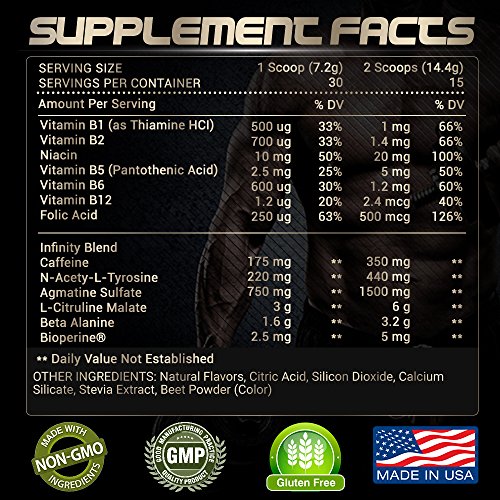 ENERGY, PUMP, AND FOCUS- Not only does INFINITY pre-workout drink energize your workouts, but also ensures peak levels of pump through safe nitric oxide booster ingredients and extreme focus. Want to build lean muscle mass, lose stubborn fat and achieve weight loss, runners looking to increase their cardio, or just looking for an extra boost of caffeine before workouts? INFINITY is the preworkout mix for you. No top rated pre workout product is complete without all of these crucial elements.