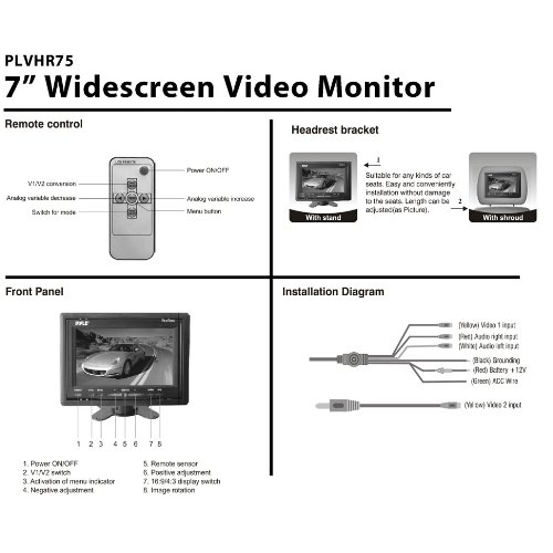 This 7” headrest monitor displays NTSC or PAL in crystal-clear clarity at a 1440 x 234 resolution. It takes two video inputs, so you can hook up everything from your DVD player to your favorite video games. Backlit by a cold cathode filament tube for a high contrast ratio. Includes headrest shroud and universal stand mount. Comes with 12 V power supply. On-screen display menu can be controlled using the built-in buttons or the included fully functional remote control.Feature